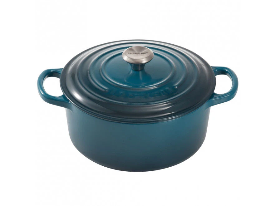 De Deep Teal – blauwgroene – Signature braadpan van Le Creuset heeft een diameter van 24 cm. De ronde pan van geëmailleerd gietijzer heeft een inhoud van 4,2 liter, bedoeld voor 4 tot 6 personen. De braad-/ stoofpan heeft extra grote grepen. De ronde vorm maakt de Signature braadpan geschikt voor soep en stoofgerechten als boeuf bourguignon.