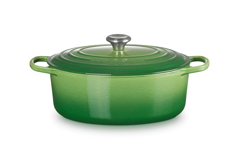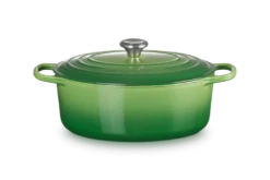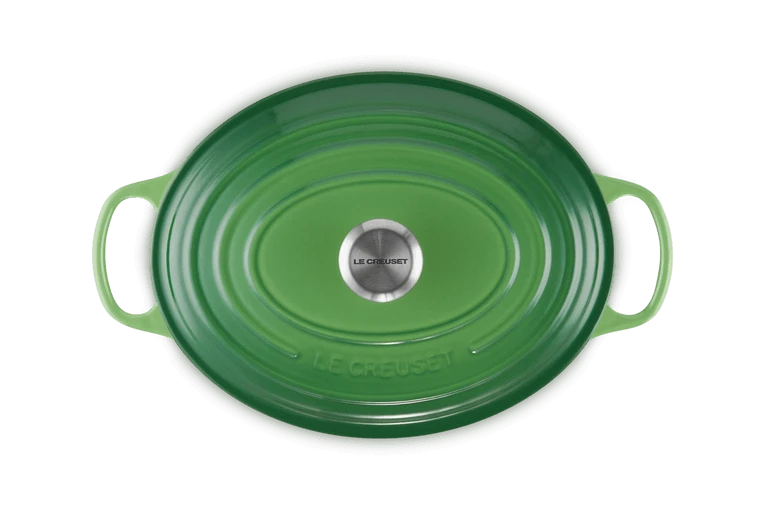 De bamboo braadpan van Le Creuset heeft een diameter van 31 cm. De groene, ovale pan van geëmailleerd gietijzer heeft een inhoud van 6,3 liter, bedoeld voor 6 tot 8 personen. De braad-/ stoofpan heeft extra grote grepen. De ovale vorm maakt de pan geschikt voor langwerpige stukken vlees en gevogelte.