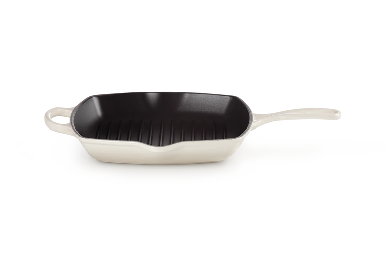 De skillet van Le Creuset is een vierkante grillpan met een vaste handgreep. Deze pan is gemaakt van geëmailleerd gietijzer in de kleur meringue, heeft een tegengreep en twee schenktuiten. De grillpan is 26 x 26 cm en heeft een totale lengte van 44,5 cm lang. Gebruik de grillpan voor het grillen van vlees, vis en groenten.