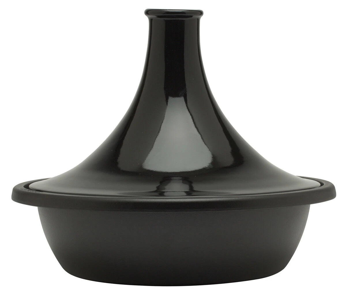 De glanzend zwarte Le Creuset tajine is vervaardigd uit gietijzer en aardewerk en heeft een diameter van 35 cm. De pan is inductie- en ovengeschikt. De zwart geëmailleerde gietijzeren bodem zorgt voor een goede warmtegeleiding en houdt warmte langdurig vast.