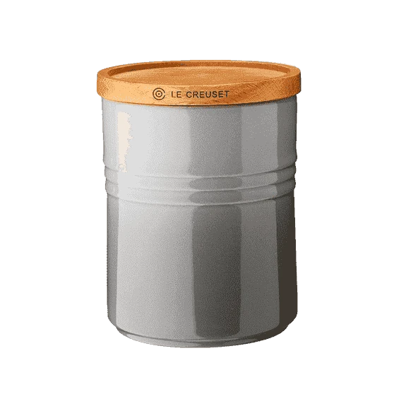 De Le Creuset voorraadpot is gemaakt van grijs aardewerk en is voorzien van een houten deksel. De voorraadpot heeft een diameter van 10 cm, is 12 cm hoog en heeft een inhoud van 540 ml. Gebruik voor het opbergen van diverse ingrediënten.